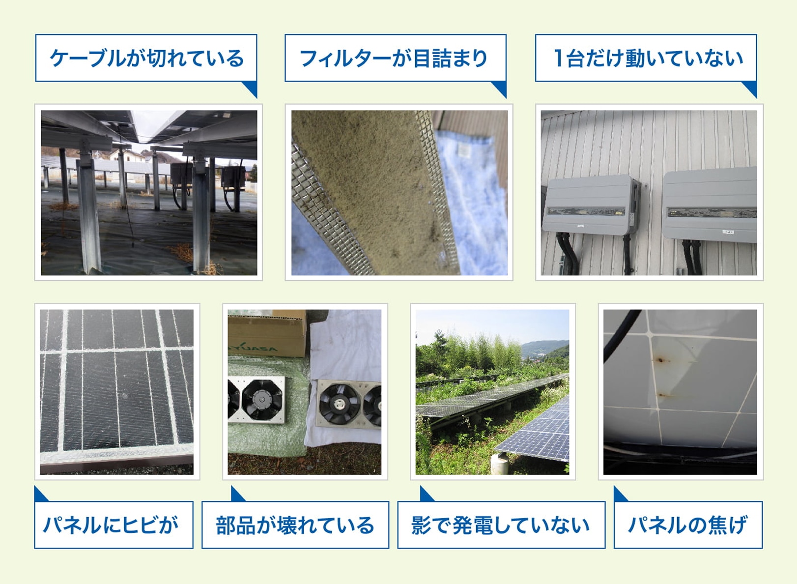 太陽光発電設備のトラブルは思いがけず発生します。 太陽電池パネルの破損、ケーブルの断線、フィルターの目詰まり、機器の故障、草木の繁茂による発電不良、等々。10年、20年と将来に渡り設備を正常に運転させる為には、保守点検と維持管理が必要になります。
