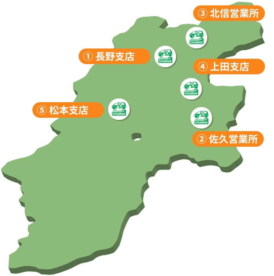 デンセンは、県内5拠点(長野・佐久・北信・上田・松本)に、皆様の電気自動車(EV)充電用コンセントを設置し、電気自動車ユーザーの充電インフラ補完手段(緊急用)として活用していただく取り組みをおこなっています。
