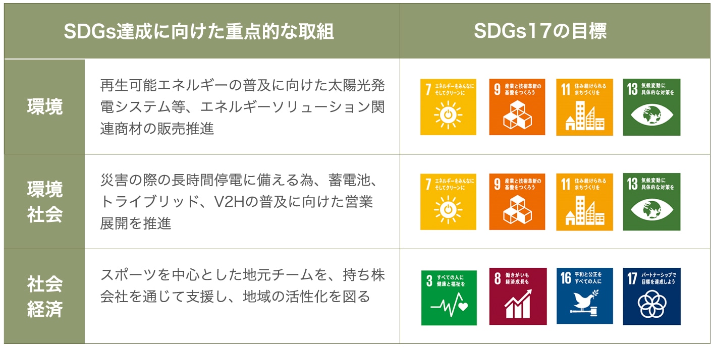 これは、SDGsの達成と目的を同じくするものであり、社員一人ひとりがそのことを自覚し、それぞれの役割を果たしていくことにより、SDGsの達成に貢献していきます。