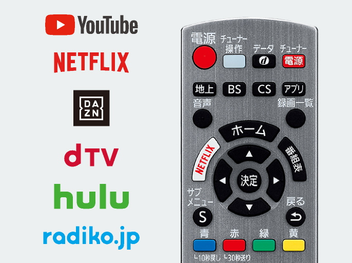 チューナー部は地上デジタル/BS/110度CS放送に対応。さらに、YouTube、NETFLIX(ネットフリックス)などのインターネット動画配信サービスもお楽しみいただけます。