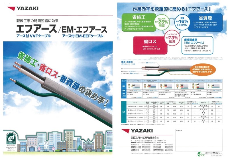 ース付VVF(当社製)に比べ、『エフアース』は施工時間を25%程度短縮でき、作業時に