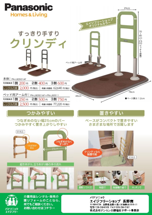 2018.11.26 ~すっきり手すり クリンディ~ すっきり手すり 【クリンディー】 のご紹介デス!! 【つかみやすい】つなぎめのない幅25cmのバーつかみやすく、起き上がりしやすい 【置きやすい】ベースがコンパクトで置きやすく、起き上がりの邪魔になりにくい そんな手すりいかがですか??色はブラウンとグリーンの2色展開グリーンはエイジフリーショップのオリジナルカラーとなっております!!