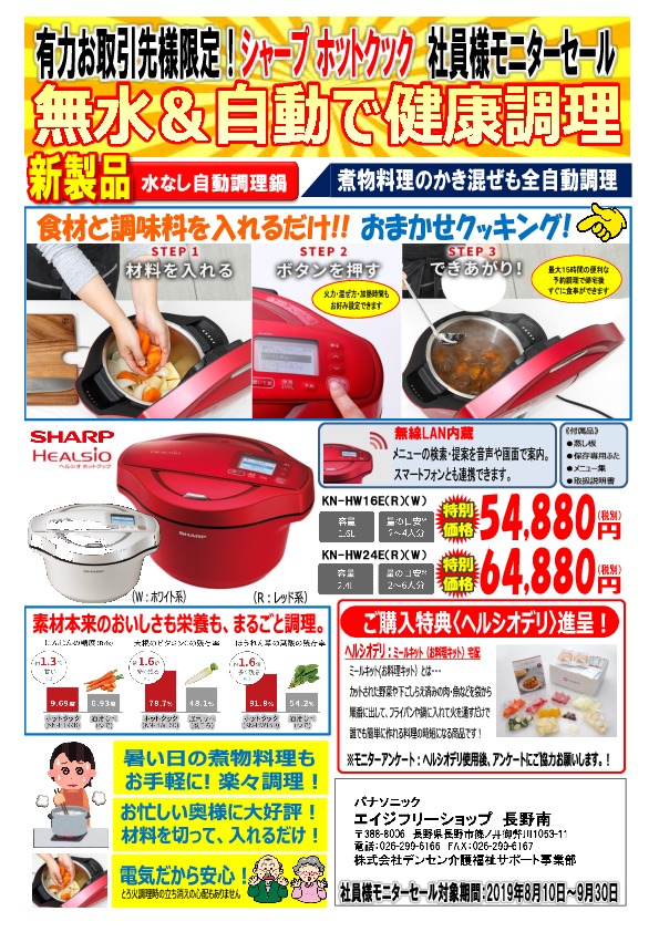 2019.08.26 ~シャープ ホットクック~ 今回は、無水&自動で健康調理が出来る、『シャープ ホットクック』のご案内です!!食材と調味料を入れて、ボタンを押すだけ!!なので、暑い日の煮物料理もお手軽に!楽々調理!お忙しい奥様にも大好評♪電気なので、一人暮らしや老夫婦の方にもオススメ。お孫さんからのプレゼントとしても人気の商品です。もうすぐ敬老の日…プレゼントにいかがでしょうか??素材本来のおいしさも栄養も、まるごと調理してくれるんですよ!!※レンタル品ではございません。
