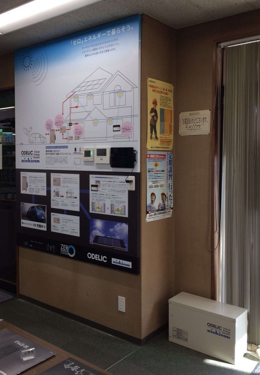支店内には「オーデリック×ニチコンのトライブリッド蓄電システム」の分かり易い展示