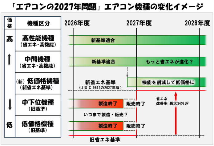 これにより本当の意味での低価機種のエアコンは2027年以降には市場からほぼ姿を消してしまう可能性があります。
