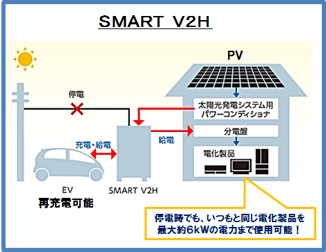 ③ 停電時もEVからの給電(V2H)に加え、PV→EVへの再充電が可能なので、