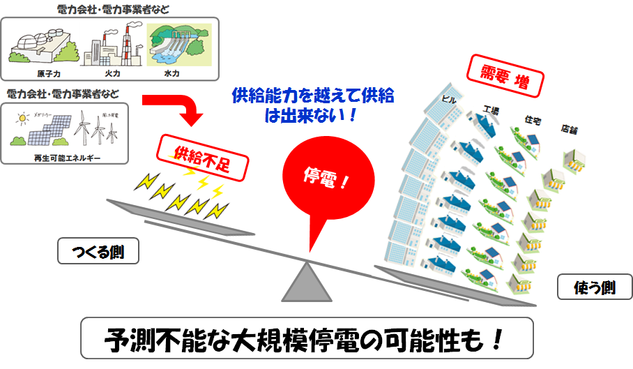 発電した電気は「貯められない」ので、需要に対して供給能力が不足してしまった場合、