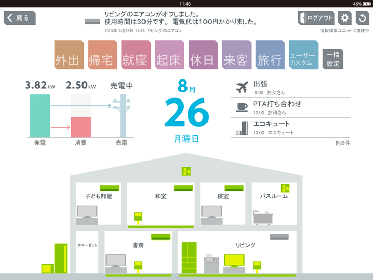 アコン、ヒートポンプ式床暖房設備(エコヌクール)、エコキュートなどの機器を WiFi で