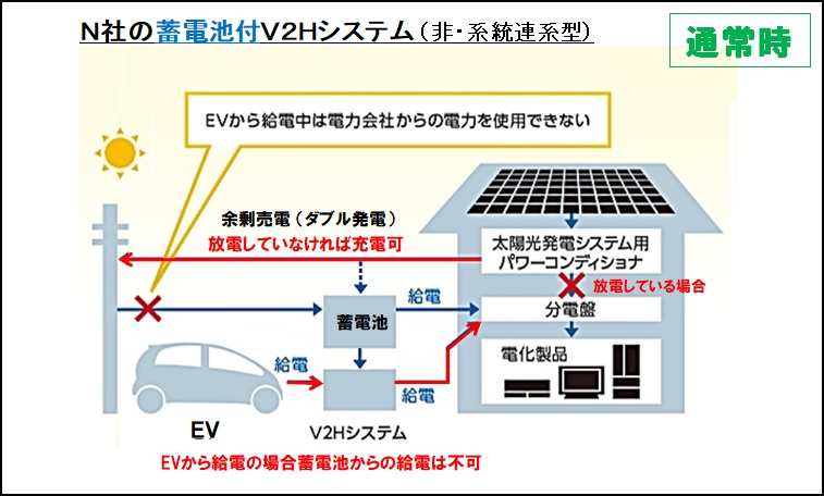 れる電力は系統へ売電出来ないこと、また多くのV2Hシステムが非・系統連携であるこ