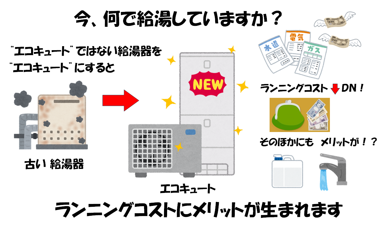 すでに給湯器を使われている場合に、電気温水器、燃焼式 などなど、エコキュートではない給湯器を “エコキュート” にするとランニングコストで比較した場合、エコキュートが一番安くなります。エコキュートを1としたら 電気・石油・ガスは 2~4倍に! もし太陽光発電 × エコキュートの組み合わせが出来るのであれば、余剰電力を有効活用してランニングコストをもっと抑えることが出来ます。