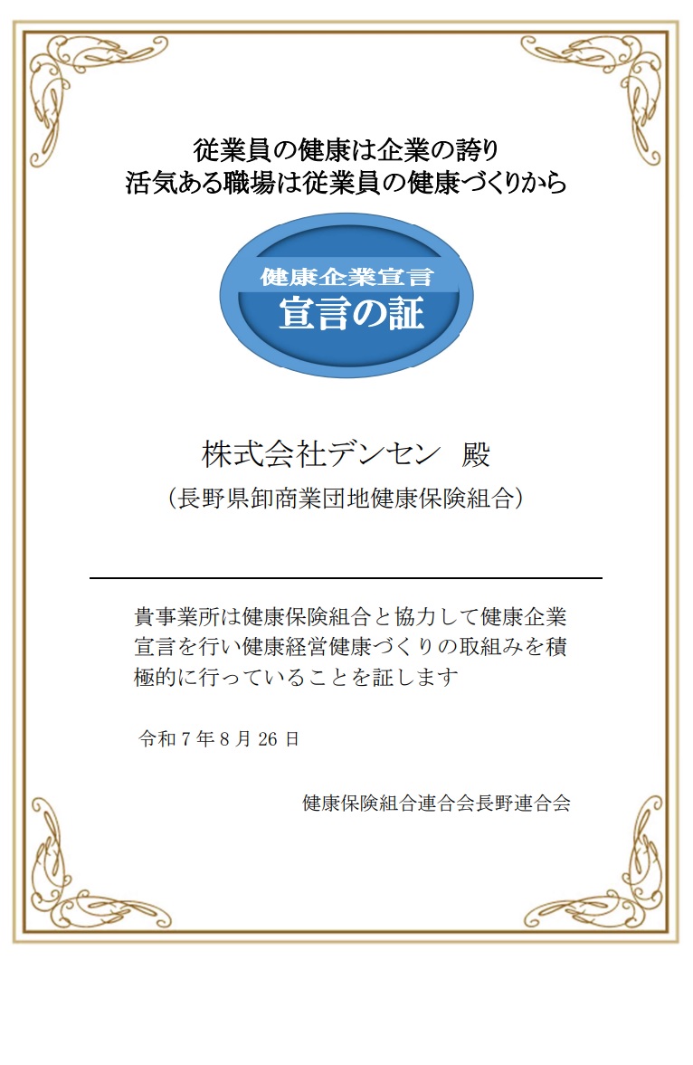 この度、健康保険組合連合会へ2025年度の健康経営エントリーを実施し、8月26日に受理されました。(以下 健康宣言の証)
