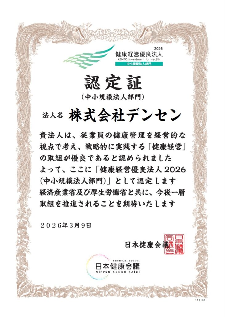 デンセンは、社員がより健康で安全に働いて頂く為の環境を提供していくと共に社員自らが健康に対して意識した対応に努めて頂ける様、2021年9月に健康経営の推進を宣言しました。