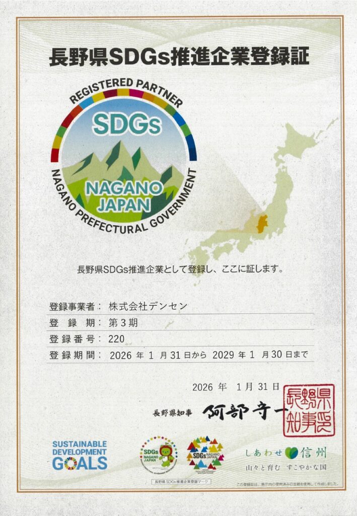 2020年に第3期での登録が認められ、今回で2回目の更新となりますが前回に引き続き、長野県SDGs推進企業としての更新が認定されました。