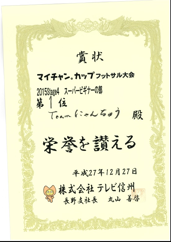 弊社の若手社員で結成しているフットサルチーム[Team にゃんちゅう]が12月27日(日)に開催されたテレビ信州主催の「マイチャン。カップ フットサル大会」へ出場し、見事に優勝しました!