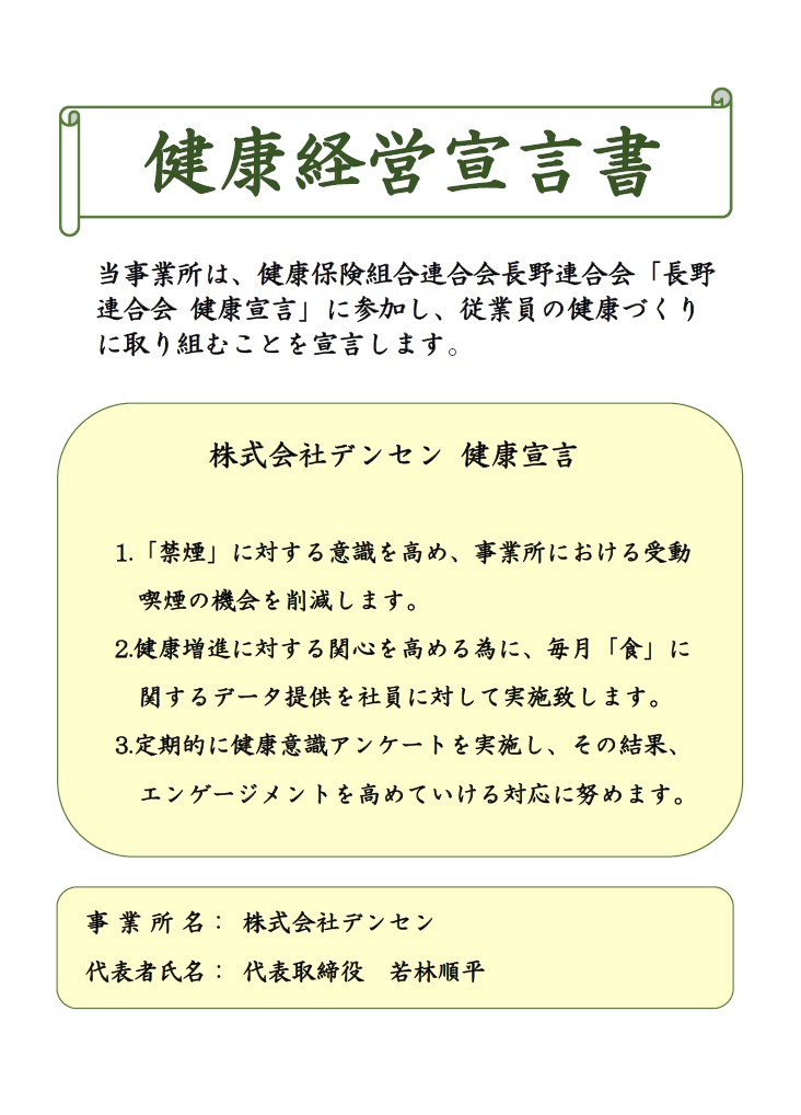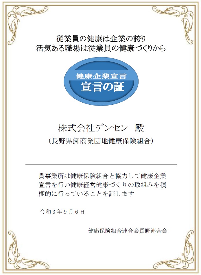 弊社としては、社員がより健康で安全に働いて頂く為の環境を提供していくと共に、社員自らが健康に対して意識した対応に努めて頂ける様、この度健康保険組合連合会へ[健康経営]を宣言し、9月6日に受理されました。(以下 健康宣言の証)