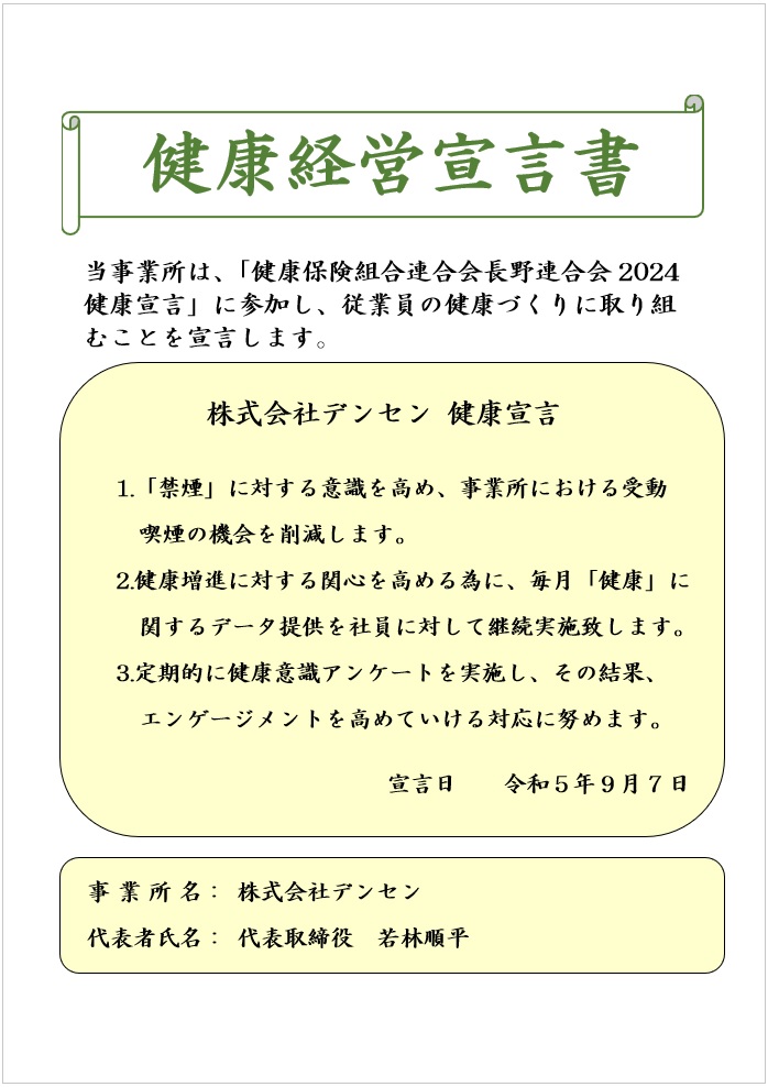 これに伴い、健康経営宣言書へ弊社の取り組みを宣言し、全社員へ発信致しました。