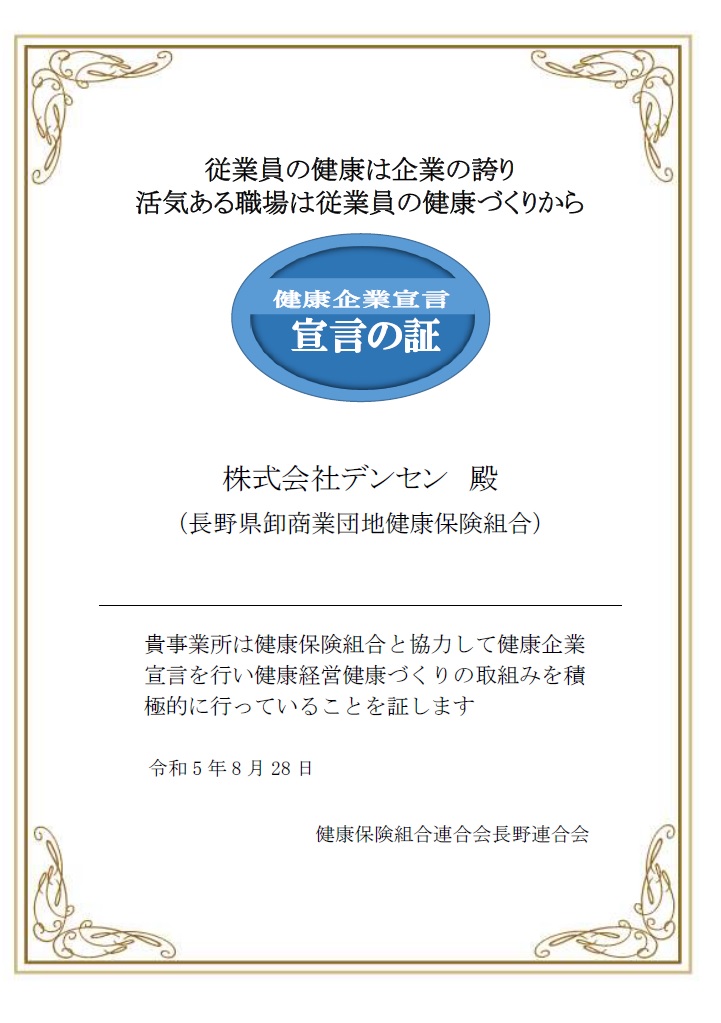 この度、健康保険組合連合会へ2024年度の健康経営エントリーを実施し、8月28日に受理されました。(以下 健康宣言の証)