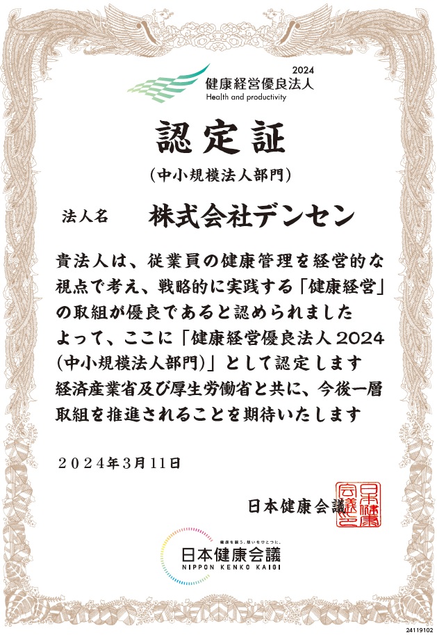 デンセンは、社員がより健康で安全に働いて頂く為の環境を提供していくと共に社員自らが健康に対して意識した対応に努めて頂ける様、2021年9月に健康経営の推進を宣言しました。